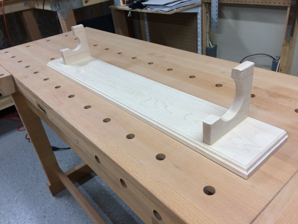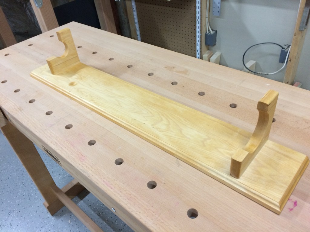 Poplar display stand 33″ wide, 5-1/2″ tall, 5-1/2″ deep. Finished with Watco Golden Oak Danish oil.