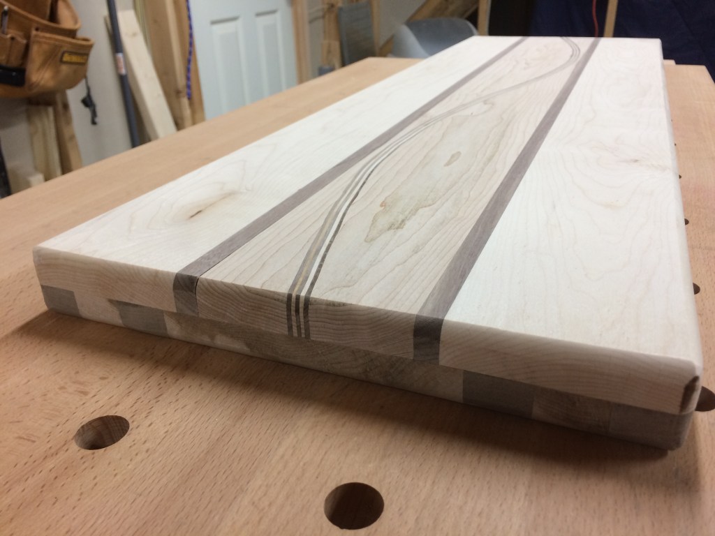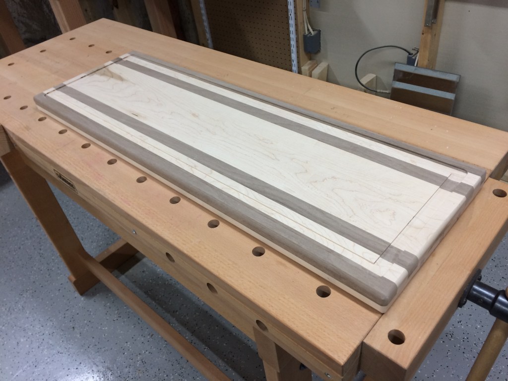 Dual sided walnut and maple serving board. Liquid groove routed on one side. Approx. dimensions 11-1/2″ wide, 36″ long, 1-1/2″ thick. Finished with Howard Cutting Board Oil.