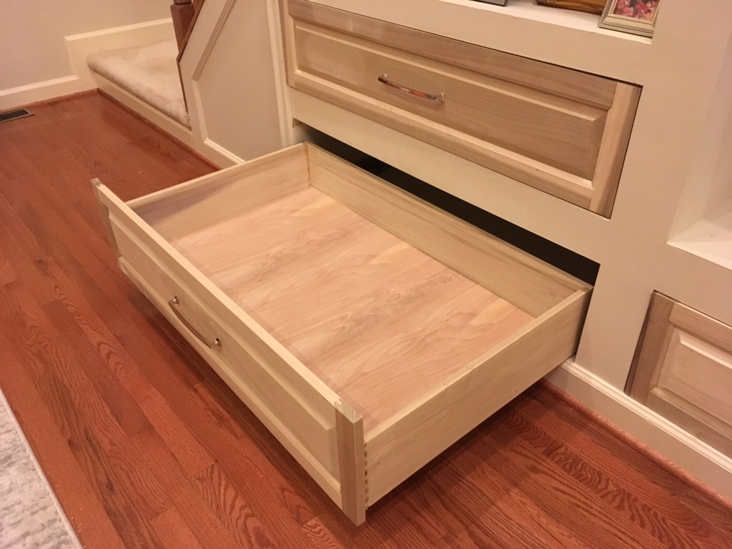 Doors and drawer front rails, stiles, and panels made from 3/4″ milled poplar. Painted with Benjamin Moore Regal Select semi-gloss interior. Drawer boxes finished with Minwax semi-gloss polyurethane.