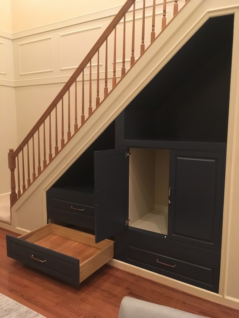 Conversion of poorly utilized space under staircase to provide greater storage.