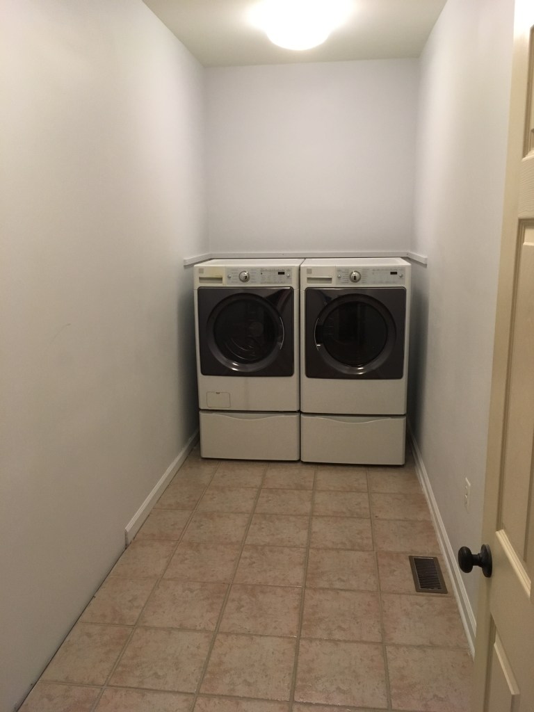 I started by clearing out the room and patching the drywall. The baseboard was cut away to allow for the installation. A support structure was mounted above the washer/dryer to accommodate the shelf.