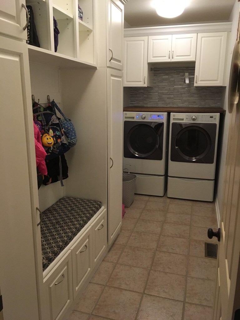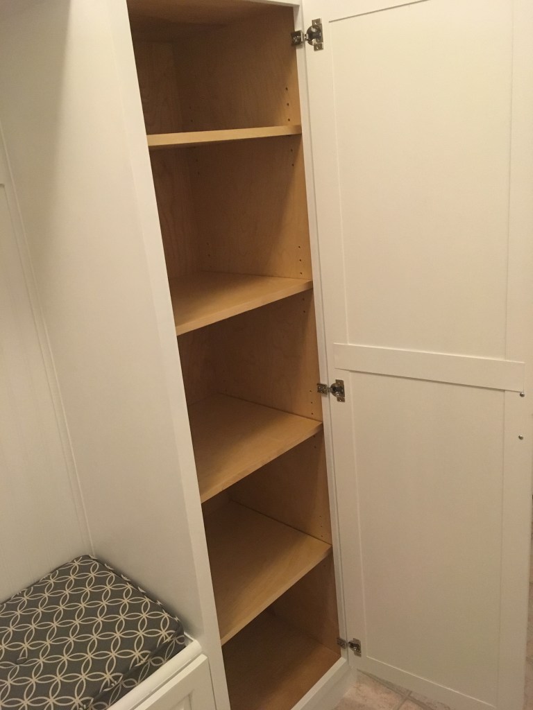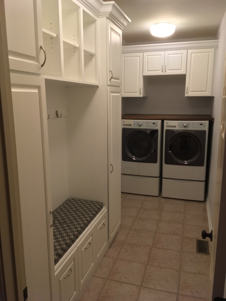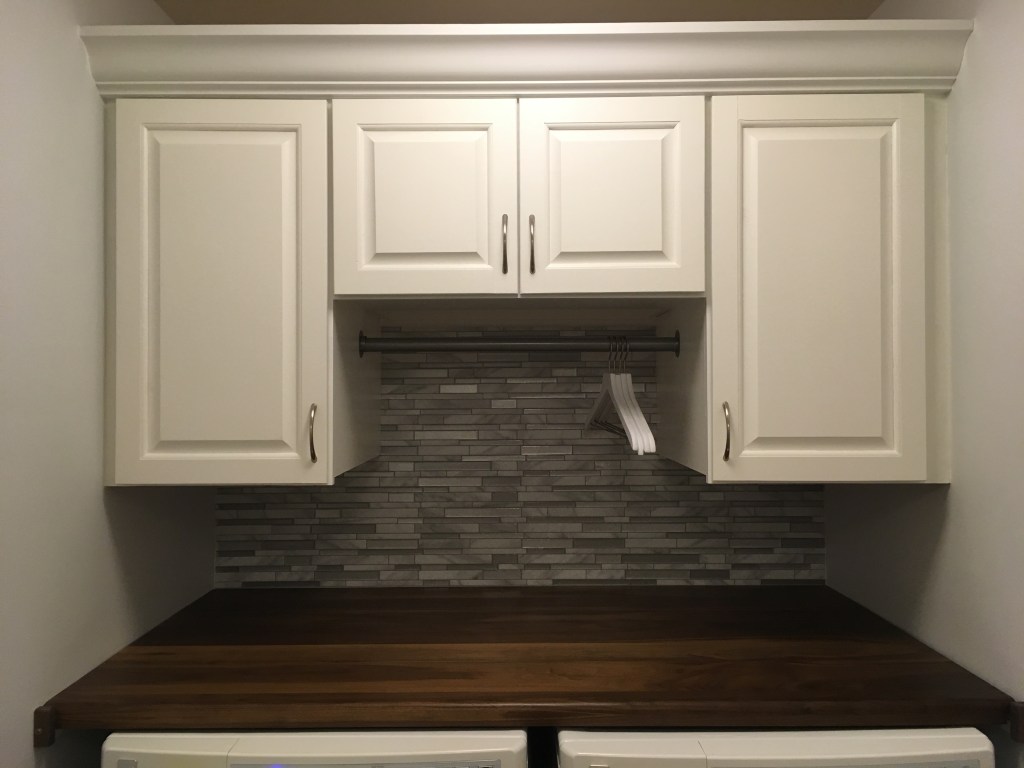 All cabinet doors and drawer front were hand milled, rail & stile construction from 3/4″ poplar stock. The cabinet assemblies and drawer boxes were 3/4″ or 1/2″ cabinet grade birch plywood, respectively. The shelf above the washer/dryer is 3/4″ solid walnut, with an MDF backerboard.