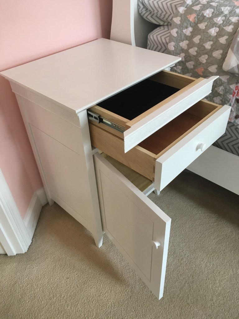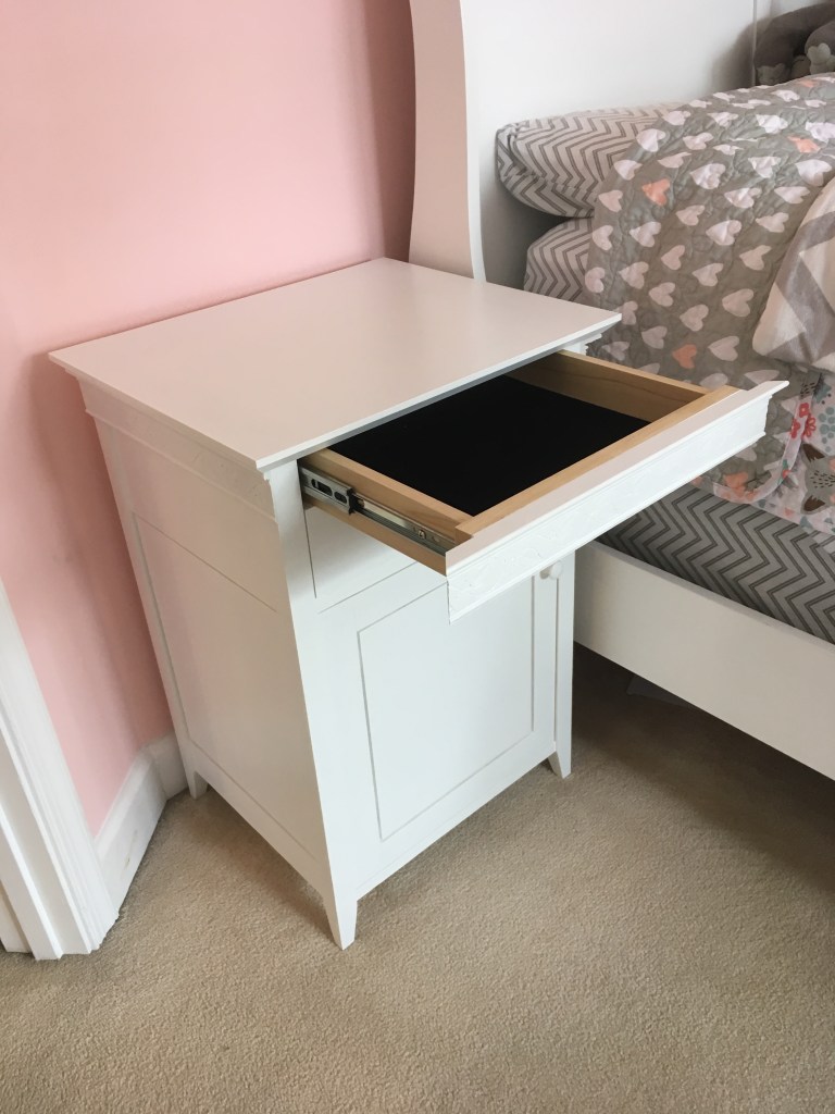 Poplar case and drawer boxes, with Blum soft close slides and hinges. Features “secret” drawer hidden behind patterned moulding. Secret drawer lined with black velvet. Approx. dimensions 28″ tall, 17″ wide, 15″ deep. Finished with Benjamin Moore Advance alkyd paint, interior finished with satin polyurethane.