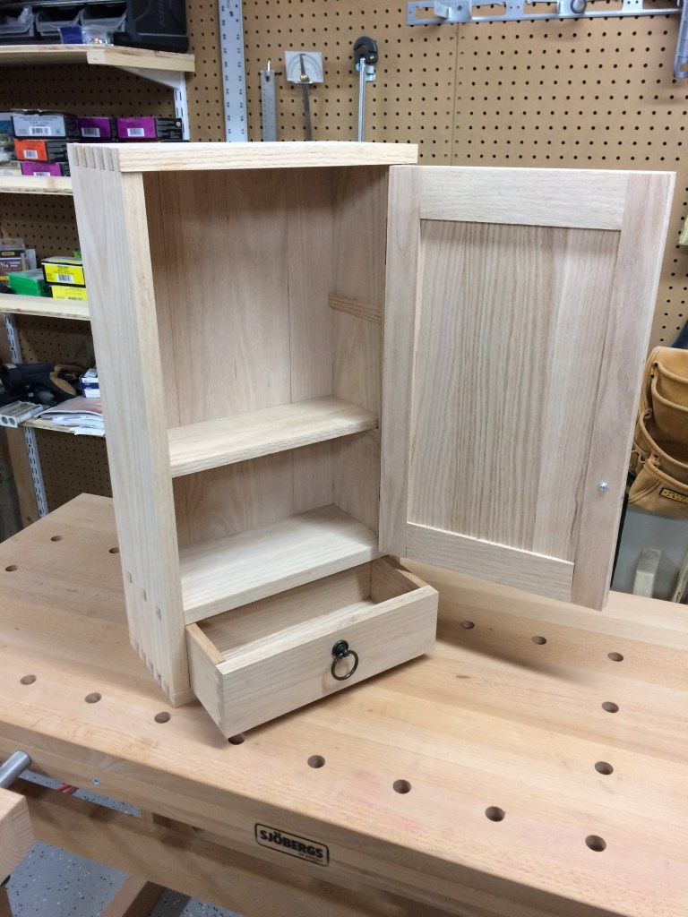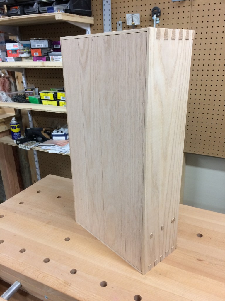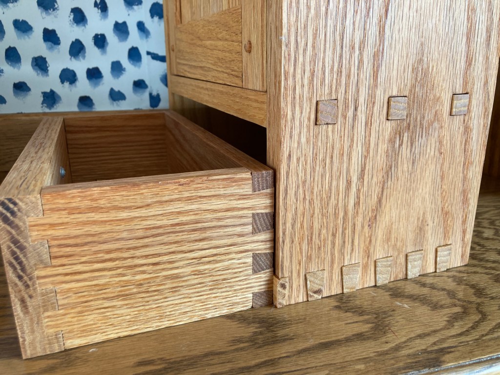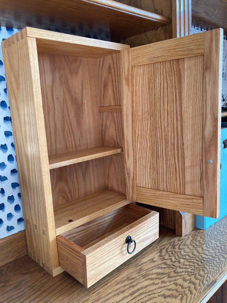 Red oak tabletop cabinet with drawer and adjustable shelf. Proud dovetail and tenon joinery on case, with half-blind dovetails on drawer box. Approx. dimensions 13″ wide, 6″ deep, 24″ tall. Finished with Watco natural Danish oil.