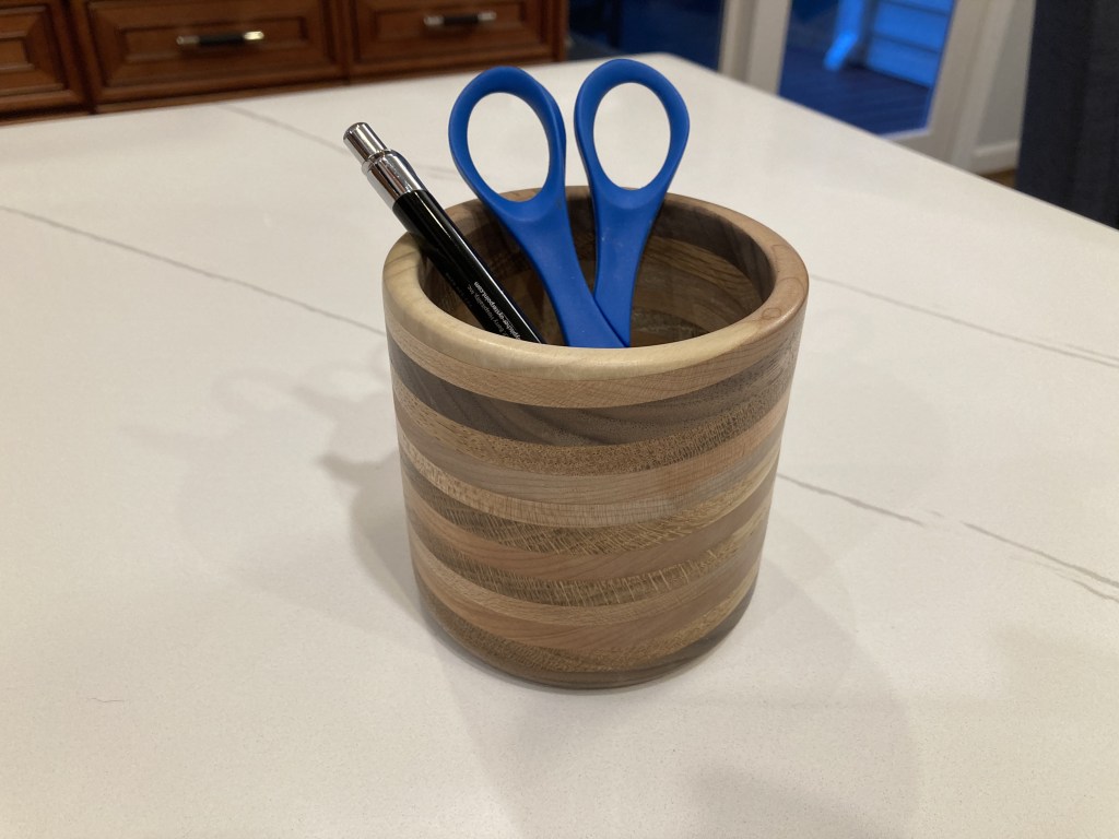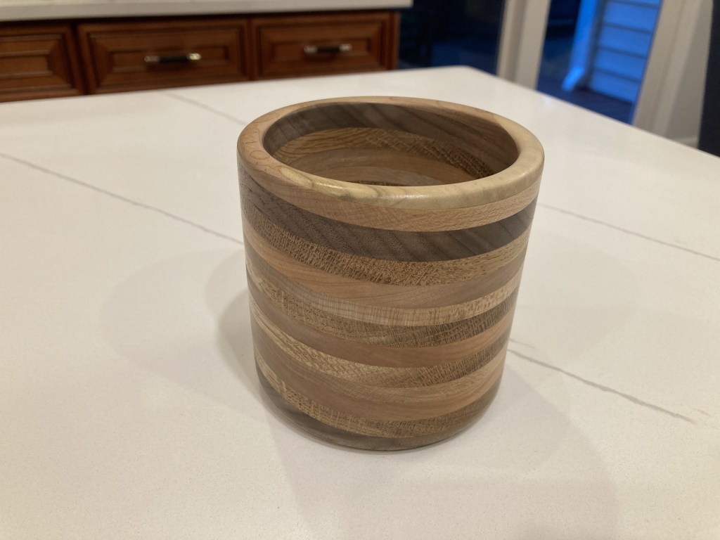 Layered walnut, cherry, white oak, maple, and poplar. Turning blank rotated 7.5 degrees to achieve angled appearance. Approximate dimensions 4″x4″. Finished with General Finishes Wood Turner’s Finish.