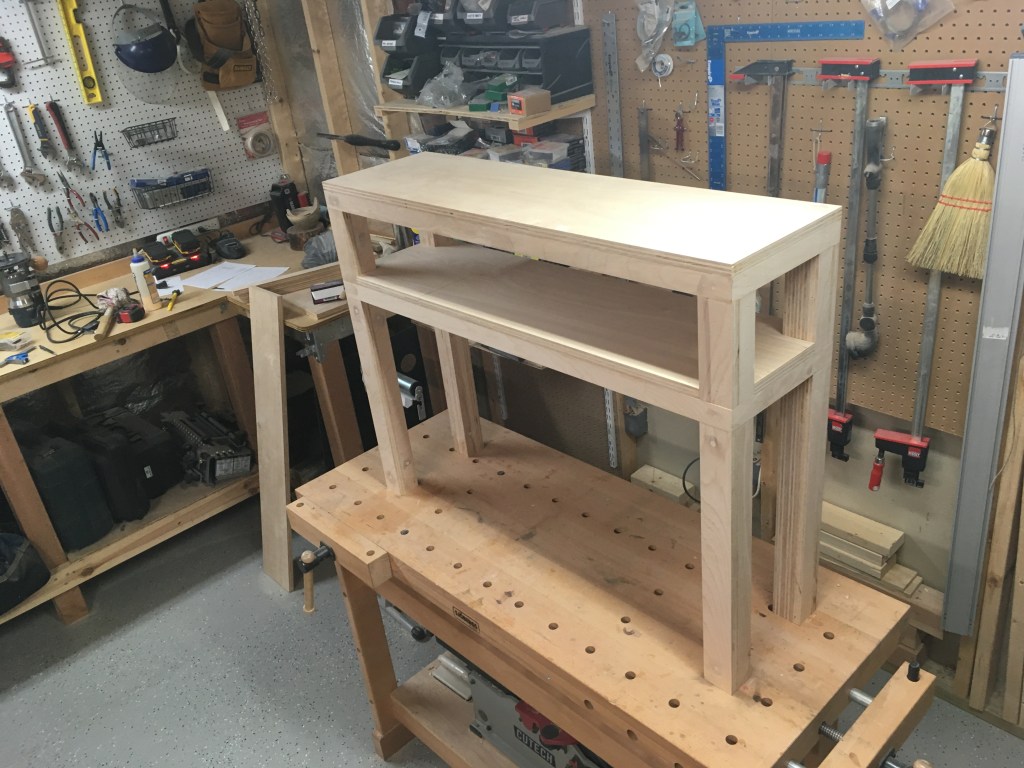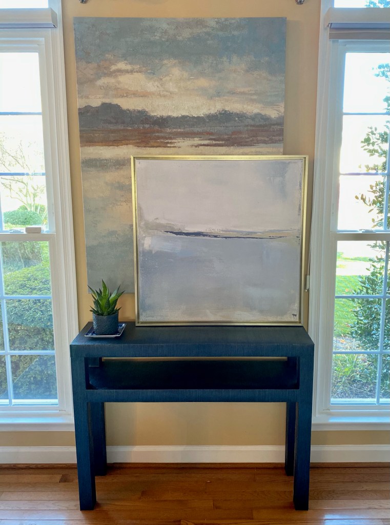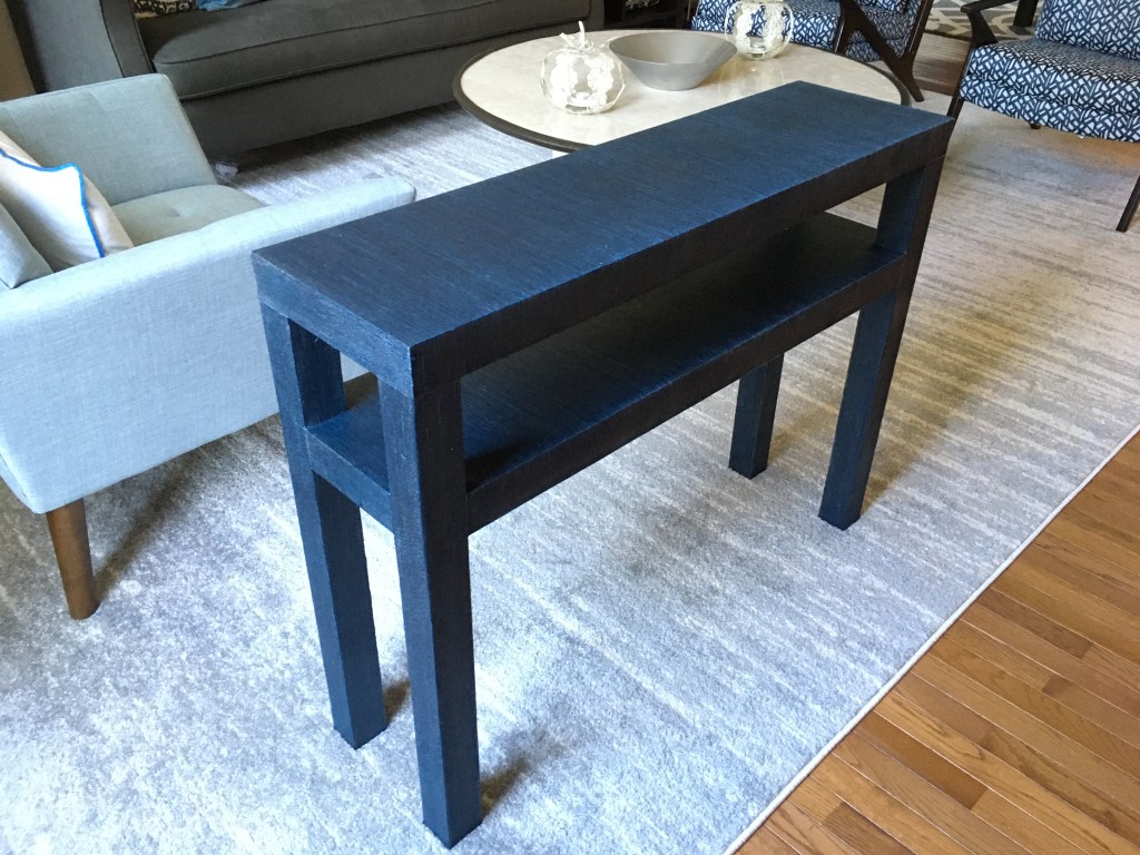 Layered 3/4″ cabinet-grade birch plywood construction. Covering is indigo Schumacher grasscloth wallpaper adhered with cyanoacrylate glue. Approx. dimensions 52″ wide, 16″ deep, 33.5″ high. Finished with five coats of Watco Crystal Clear semi-gloss lacquer.
