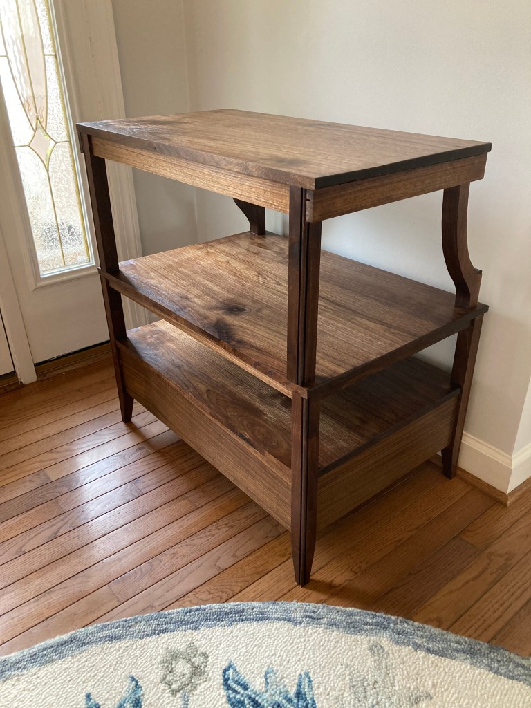 Solid walnut night stand with poplar drawer box. Approx. dimensions 29″ high, 28″ wide, 19″ deep. Includes drawer with Blum soft close drawer slides and extendable table with faux-leather surface. Finished with Watco Dark Walnut Danish oil.