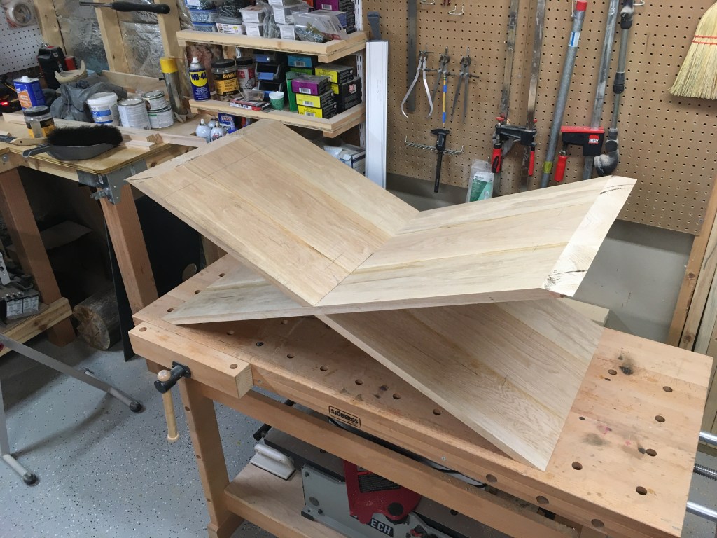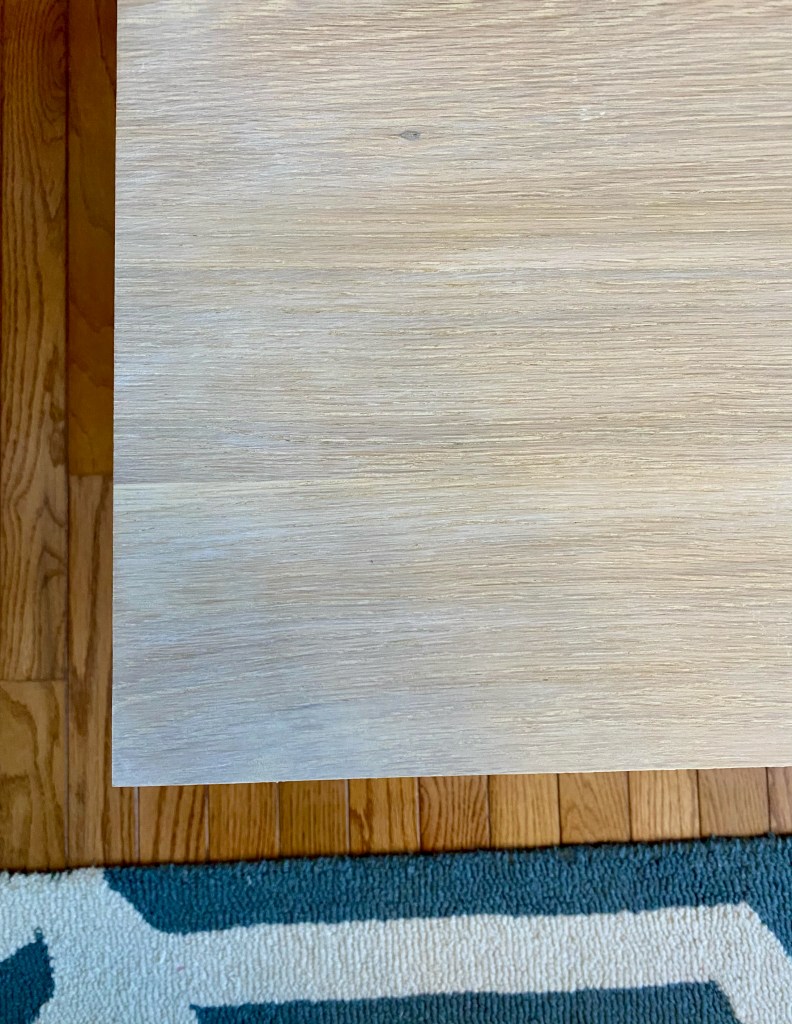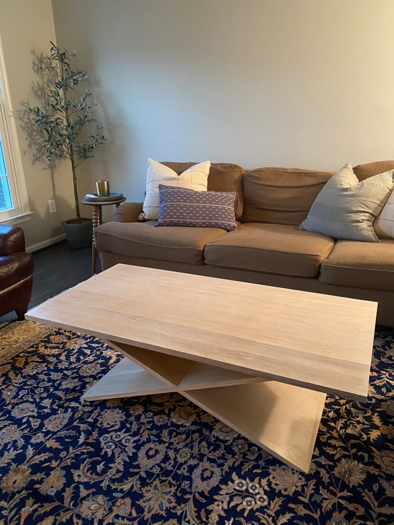 White oak coffee table with modified iron fasteners. Approx. dimensions 17″ tall, 52″ long, 26″ wide. Legs are two solid pieces with a cutout to interlock. Finished with Verathane White Wash wood stain and Verthane water-based satin polyurethane.