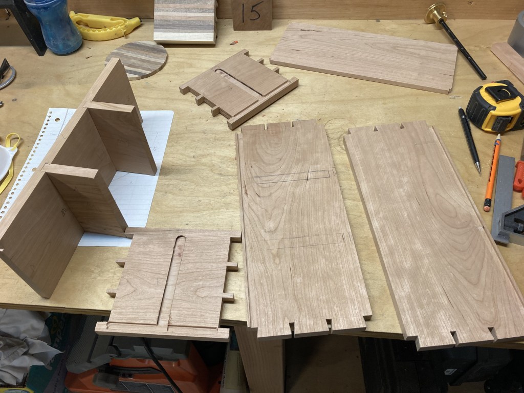 Four-section utensil caddy made out of cherry, with purpleheart accents and dovetail joinery. Approximate dimensions 13-1/4″ long x 6″ wide x 5-1/2″ tall. Finished with Watco Danish Oil natural finish. Modeled after Crate and Barrel Carson Flatware Caddy.